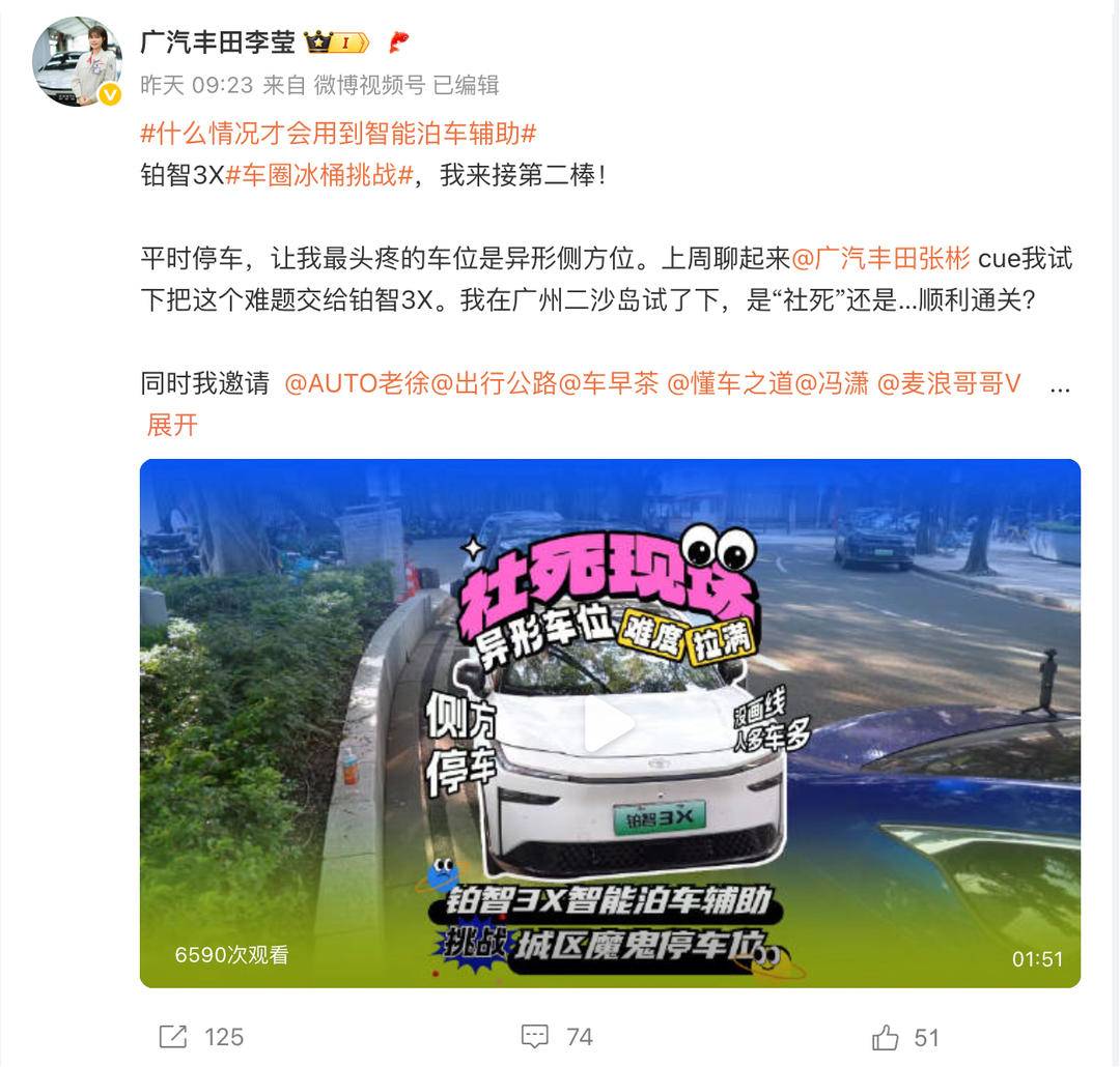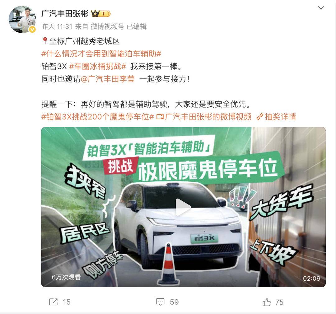 8月4日,广汽丰田以一场不同常规的"#车圈冰桶挑战#"引爆汽车圈——以#铂智3X挑战200个魔鬼停车位#为主题的实测活动,通过 @广汽丰田张彬 @广汽丰田李莹 邀请媒体、大V及用户共同参与,全方位验证了铂智3X智能泊车系统在极端场景下的技术硬实力,更以"合资车智能化破局者"姿态引发行业热议。
